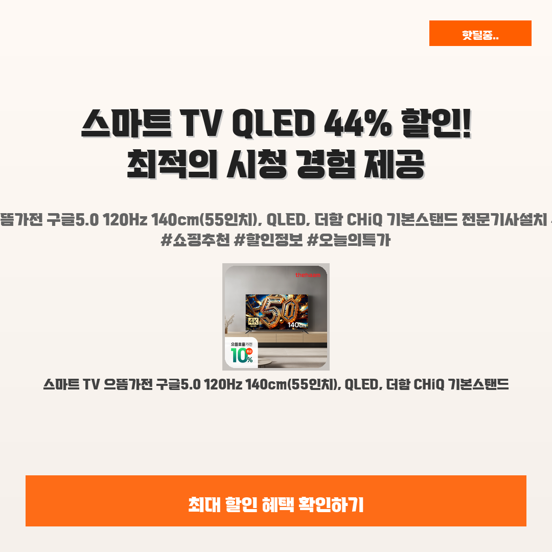 🛍️ 이 포스팅은 네이버 쇼핑 커넥트 활동의 일환으로,판매 발생 시 수수료를 제공받습니다.오늘 소개할 제품은 단연코,시청의 재미를 극대화하는 스마트 TV 으뜸가전 구글5.0 120Hz 140cm(55인치)입니다!여러분, 혹시 집에서 TV를 시청할 때 화질이 아쉽고 방식이 불편하다고 느끼신 적 있으신가요?"스마트 TV 으뜸가전 구글5.0 120Hz 140cm(55인치)"는 그런 고민을 말끔히 해결해 줄 완벽한 솔루션이에요!지금 강력한 44% 할인으로 단돈 509,000원에 만나볼 수 있으니, 이 기회를 놓치지 마세요!QLED 화면의 생생한 색감과 전문기사설치 서비스까지 제공돼서, 진정한 스마트 TV 경험을 느끼실 수 있어요.이젠 TV 시청의 품질이 달라진다는 것을 확실히 느끼실 수 있을 거예요. 후회 없..